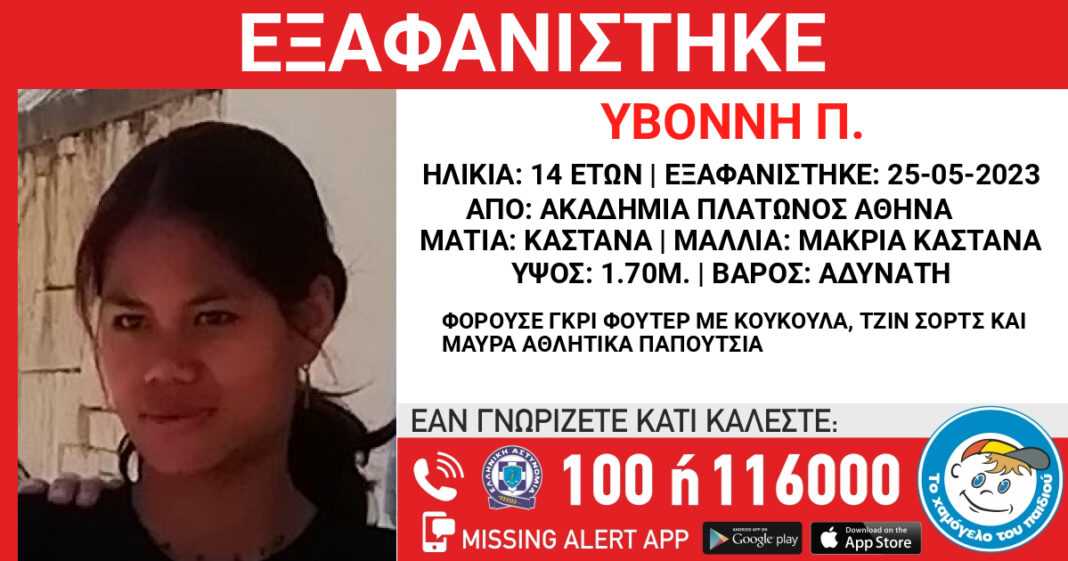 Χαμόγελο του Παιδιού: Στις 25/05/2023, μεσημβρινές ώρες εξαφανίστηκε από την περιοχή της Ακαδημίας Πλάτωνος στην Αθήνα, η Υβόννη Π., 14 ετών.