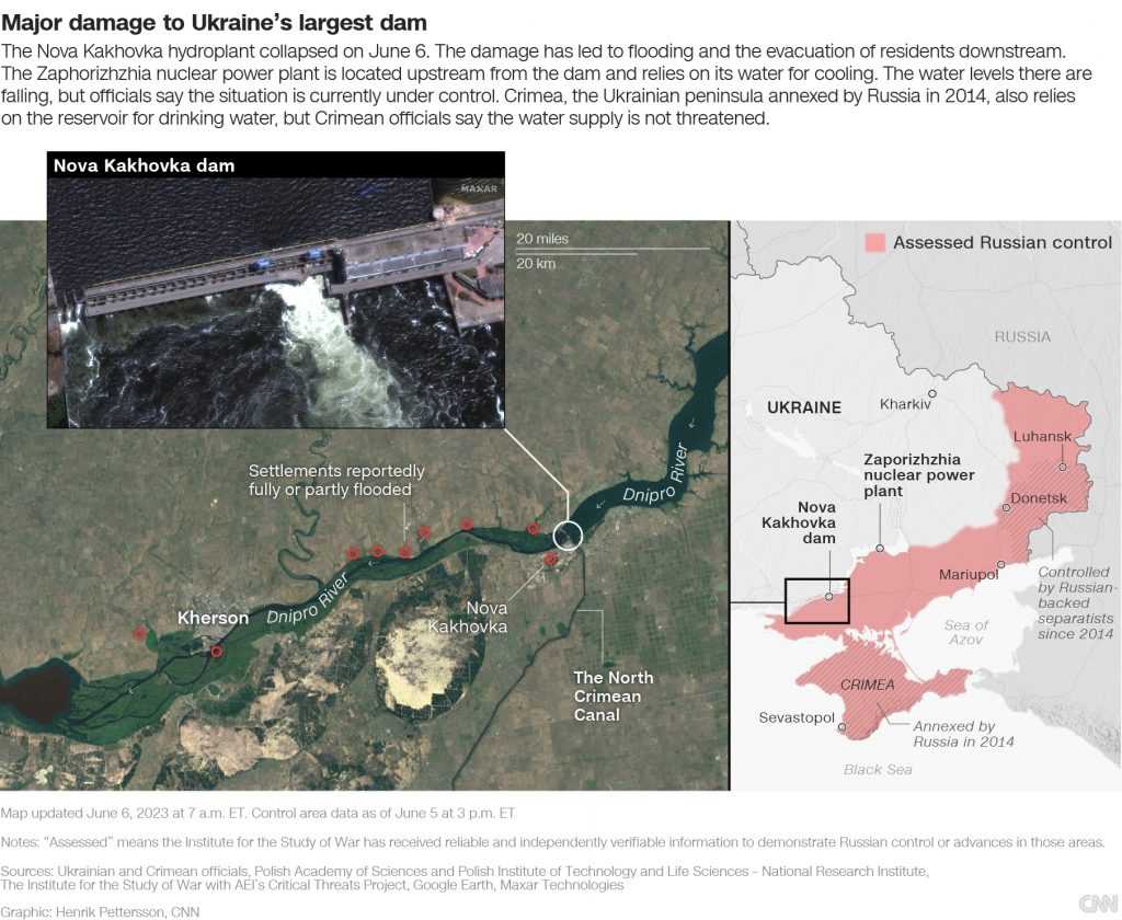 Το φράγμα αποτελεί μια γραμμή ζωής στην περιοχή ως κρίσιμη πηγή νερού για εκατομμύρια ανθρώπους στη Χερσώνα καθώς και στις περιοχές Ντνίπρο και Ζαπορίζια, είπε, και μια βασική πηγή γεωργικής άρδευσης στη νότια Χερσώνα και τη χερσόνησο της Κριμαίας – με αντίκτυπο στη γεωργία και την παραγωγή τροφίμων.
