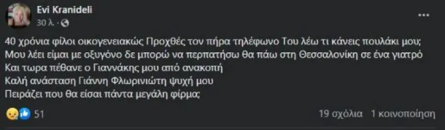 Φίλη του στο Facebook γράφει: «40 χρόνια φίλοι οικογενειακώς. Προχθές τον πήρα τηλέφωνο. Του λέω ”τι κάνεις πουλάκι μου;”. Μου λέει ”είμαι με οξυγόνο δε μπορώ να περπατήσω θα πάω στη Θεσσαλονίκη σε ένα γιατρό”. Και τωρα πέθανε ο Γιαννάκης μου από ανακοπή. Καλή ανάσταση Γιάννη Φλωρινιώτη ψυχή μου Πειράζει που θα είσαι πάντα μεγάλη φίρμα;».