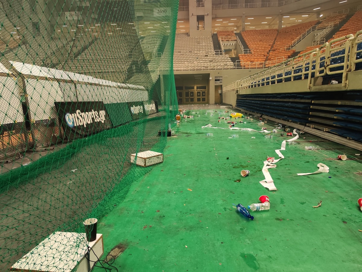 Δείτε εικόνες από το ΟΑΚΑ που είναι σαν βομβαρδισμένο τοπίο από τα πεταμένα αντικείμενα που πέταξαν οι οπαδοί του Παναθηναϊκού. Ο κόσμος του Παναθηναϊκού έδωσε βροντερό παρών στο ΟΑΚΑ απόψε όμως μετά τη λήξη του ματς φανερώθηκε η εικόνα από τα αντικείμενα που πετούσαν. Μπουκάλια, χαρτιά ακόμα και μπαλόνια βρίσκονται πίσω από το προστατευτικό δίχτυ …