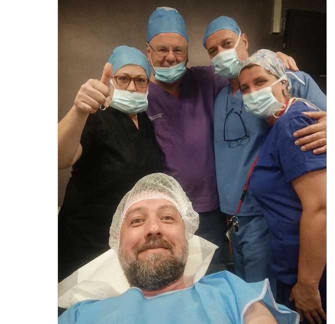 Ο γνωστός ηθοποιός, παρόλο που είναι ντυμένος σαν να μπαίνει στο χειρουργείο ή σαν να χειρουργήθηκε μόλις ποζάρει στον φακό χαμογελαστός μαζί με τους γιατρούς και το νοσηλευτικό προσωπικό.
