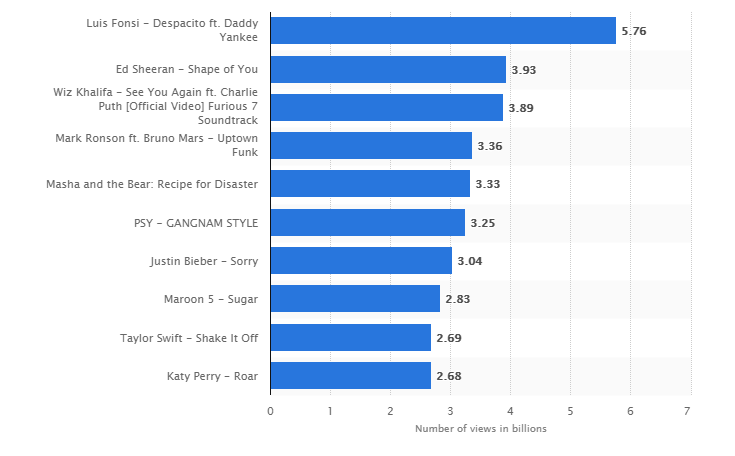 Δείτε εδώ αναλυτικά τη λίστα με τα δέκα videos με τη μεγαλύτερη θέαση για το 2018, σύμφωνα με το έγκριτο portal στατιστικών statista.com:
