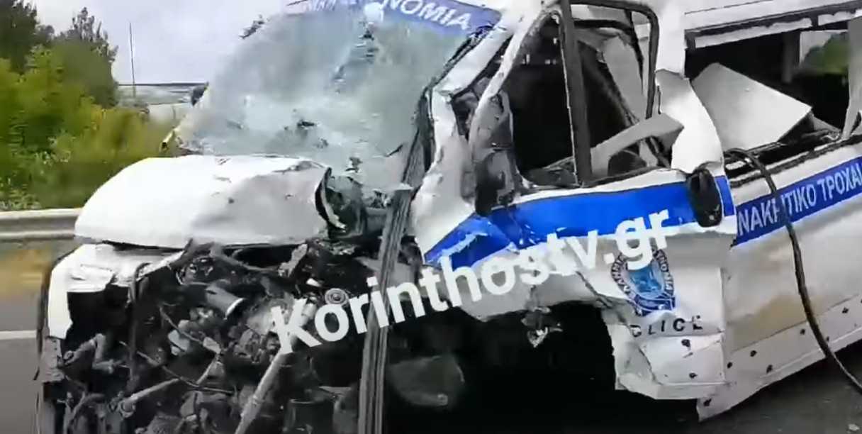 Στη σφοδρή σύγκρουση εμπλέκονται ένα ΙΧ και ένα ανακριτικό βανάκι της Αστυνομίας το οποίο ντεραπάρισε μετά τη σύγκρουση, ενώ το Ι.Χ αυτοκίνητο έχει μετατραπεί σε άμορφη μάζα.