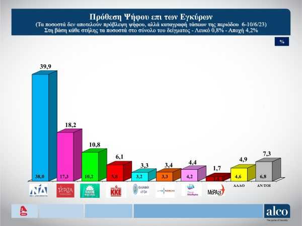 Ειδικότερα, σύμφωνα με δημοσκόπηση της Alco για τον ALPHA, η ΝΔ να καταγράφει 39,9%, ο ΣΥΡΙΖΑ 18,2% και τρίτο έρχεται το ΠΑΣΟΚ με 10,8%. Ακολουθεί το ΚΚΕ με 6,1%, η Πλεύση Ελευθερίας με 4,4%, η Νίκη με 3,4% και η Ελληνική Λύση με 3,3%. Εκτός Βουλής μένει το ΜέΡΑ25 με 1,7%.