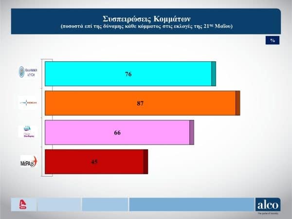 Τεράστιο ποσοστό συσπείρωσης καταγράφει η Νέα Δημοκρατία με 96%, ακολουθεί ο ΣΥΡΙΖΑ με 89%, το ΚΚΕ με 88%, η Νίκη με 87%, το ΠΑΣΟΚ με 85%. Αρκετά πιο χαμηλά από τα κόμμα αυτά βρίσκονται η Ελληνική Λύση με 76%, η Πλεύση Ελευθερίας με 66% και το ΜέΡΑ25 με 45%.