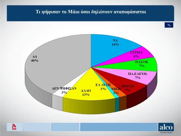Στο ερώτημα προς τους αναποφάσιστους τι ψήφισαν τον Μάιο το 40% δεν απαντά, το 16% δηλώνει Νέα Δημοκρατία, από 7% ΠΑΣΟΚ, Πλεύση Ελευθερίας και ΜέΡΑ25, ενώ το 6% δηλώνει ΣΥΡΙΖΑ.