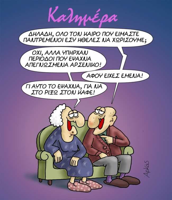 Με ένα άκρως χιουμοριστικό σκίτσο μάς καλημερίζει σήμερα Τετάρτη ο βιτριολικός Αρκάς. Στο νέο του σκίτσο βλέπουμε το αγαπημένο ηλικιωμένο ζευγάρι, την Ασημίνα και τον Ναπολέοντα, να συζητούν καθισμένοι στον καναπέ του σπιτιού τους.
