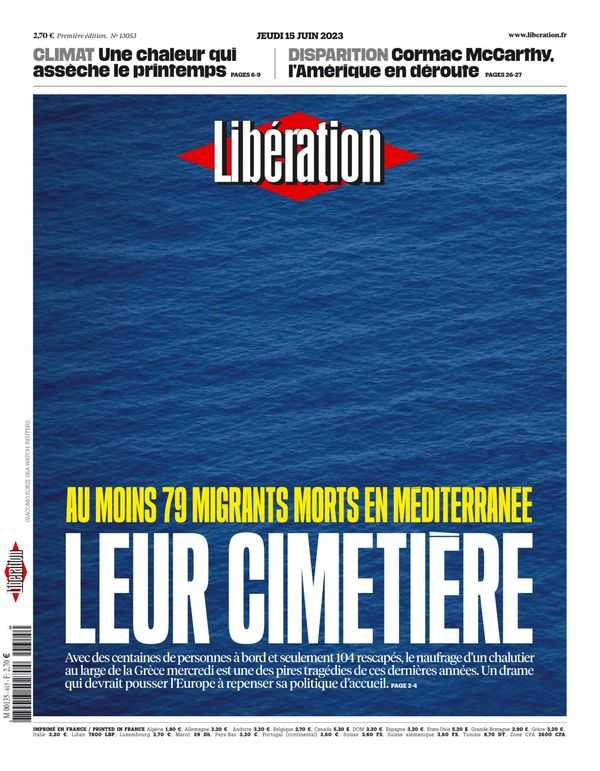 Mε ένα συγκλονιστικό πρωτοσέλιδο, αφιερωμένο στο πολύνεκρο ναυάγιο ανοιχτά της Πύλου, κυκλοφορεί σήμερα Πέμπτη (15/6) η γαλλική εφημερίδα Liberation που χρησιμοποιεί μια ολοσέλιδη φωτογραφία της Μεσογείου και ως τίτλο την έκφραση «Το νεκροταφείο τους». Η ιστορική εφημερίδα είναι ιδιαίτερα επικριτική απέναντι σε όσους υιοθετούν εχθρική στάση απέναντι στους μετανάστες και τους πρόσφυγες.