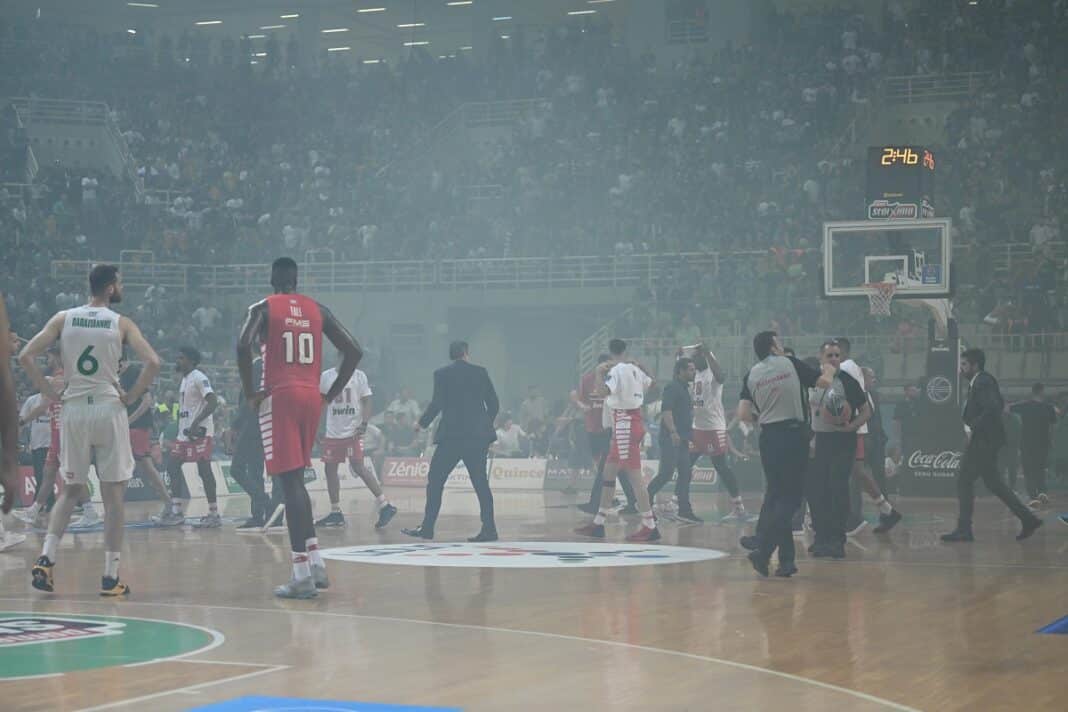 Οι διαιτητές μετά από ρίψη καπνογόνων στο προστατευτικό δίχτυ διέκοψαν το παιχνίδι μέχρι να καθαρίσει η ατμόσφαιρα. Μια κακή εξέλιξη που αμαυρώνει το ελληνικό μπάσκετ συνέβη 2 λεπτά και 46 δευτερόλεπτα πριν τη λήξη του τέταρτου τελικού στο ΟΑΚΑ. Ο κόσμος του Παναθηναϊκού είναι στα κάγκελα, με την σημερινή απόδοση της ομάδας του αφού ο …