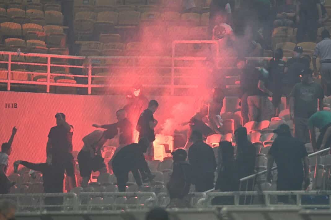 Στο ΟΑΚΑ επικρατεί… χάος και οι διαιτητές μάλλον θα διατάξουν την οριστική διακοπή του τελικού. Εικόνες χάους επικρατούν εδώ και λίγα λεπτά στο ΟΑΚΑ μετά την απόφαση των διαιτητών για εκκένωση του γηπέδου. Οπαδοί των πράσινων πετούσαν ότι έβρισκαν στις δυνάμεις των ΜΑΤ ενώ ο Ολυμπιακός καταγγέλλει πως μερικοί πιο θερμόαιμοι έφτασαν μέχρι και τη …