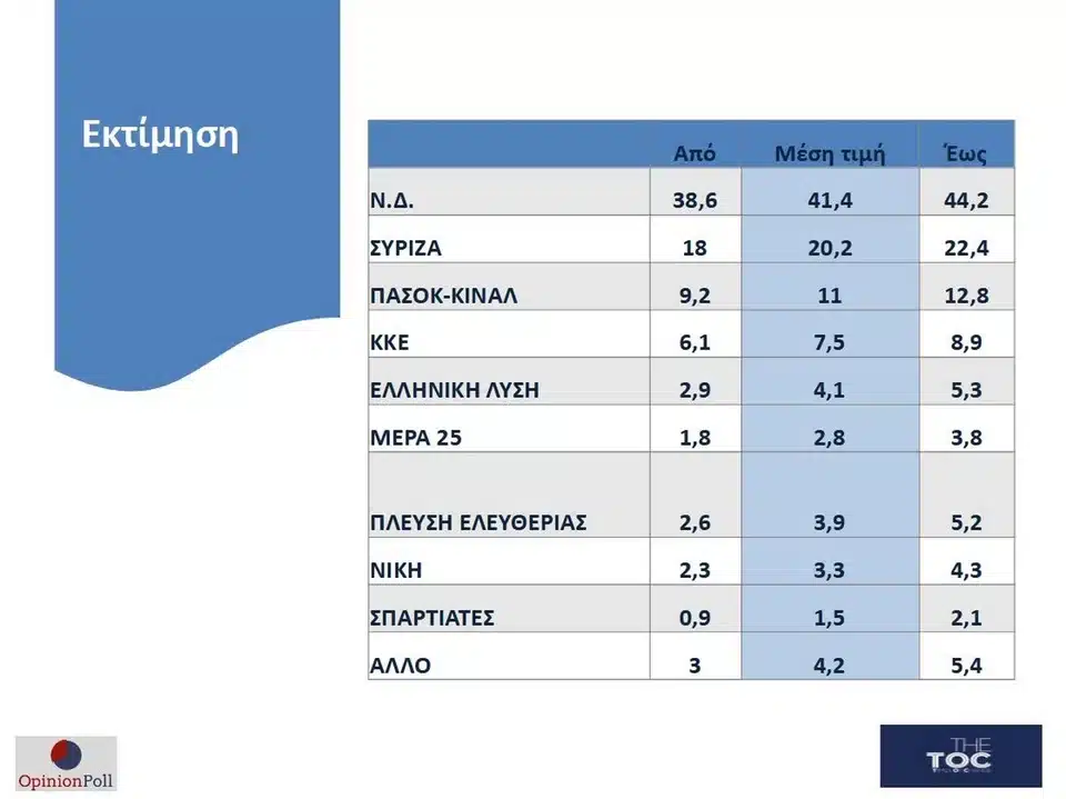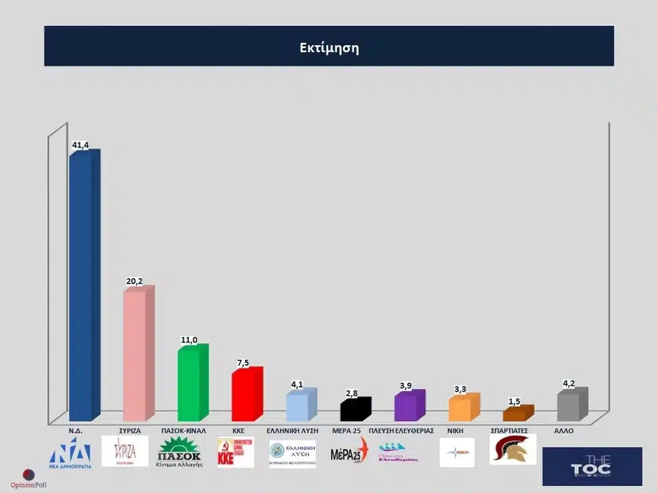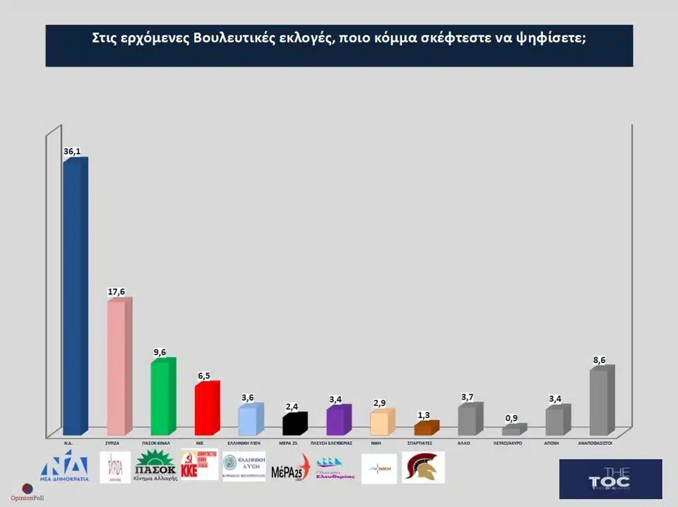 Σύμφωνα με την έρευνα της Opinion Poll για το The Toc, η σύνθεση της νέας Βουλής θα είναι πιθανώς 7κομματική, με την είσοδο στο Κοινοβούλιο της Πλεύσης Ελευθερίας και της «Νίκης».