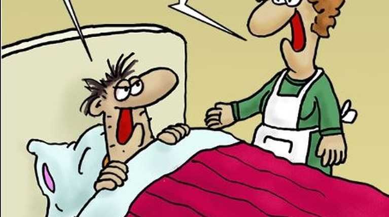 Στο εν λόγω σκίτσο βλέπουμε τη γυναίκα να προσπαθεί να ξυπνήσει τον σύζυγό της και εκείνος να αρνείται πεισματικά να σηκωθεί από το κρεβάτι!