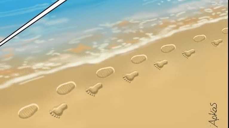 Στο σκίτσο βασικός ήρωας είναι και πάλι ο αγαπημένος Θανασάκης, αν και δεν αποκαλύπτεται, αφού βλέπουμε μόνο… τα βήματα από τις πατούσες του στην παραλία!