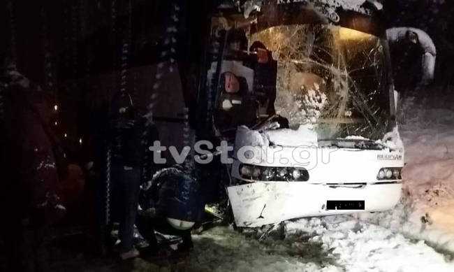 Στη θέση Βέλος και ενώ σημειωνόταν έντονη χιονόπτωση ο οδηγός του λεωφορείου έχασε τον έλεγχο και έπεσε πάνω στο εκχιονιστικό όχημα.