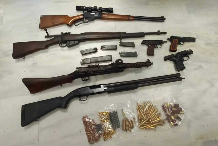 Κατά τη διάρκεια της έρευνας, βρέθηκαν και κατασχέθηκαν ένα πολεμικό οπλοπολυβόλο με γεμιστήρα, ένα πολεμικό τυφέκιο με γεμιστήρα, τρία πιστόλια με πέντε γεμιστήρες, ένα επαναληπτικό τυφέκιο με διόπτρα, μία κυνηγετική καραμπίνα και 188 φυσίγγια διαφόρων τύπων και διαμετρημάτων.