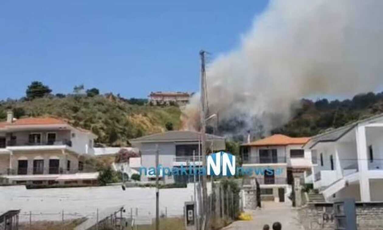 Εικόνες και βίντεο που μεταδίδει το nafpaktianews.gr δείχνουν τη φωτιά να έχει πλησιάσει επικίνδυνα κοντά στα σπίτια.