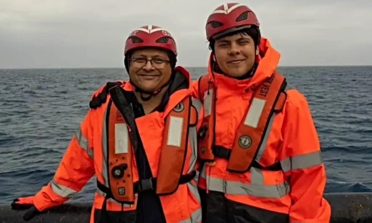 Στην εικόνα, πατέρας και γιος φαίνονται να ποζάρουν ευτυχισμένοι μαζί, με το χέρι του Sulaiman Dawood να ακουμπά προστατευτικά στον ώμο του 58χρονου πατέρα του. Και οι δύο είναι ντυμένοι για την κατάβαση των δυόμισι ωρών στην παγωμένη άβυσσο στα ανοικτά των ακτών του Newfoundland του Καναδά, με ασορτί ανακλαστικά πορτοκαλί μπουφάν, γιλέκα ασφαλείας, ειδικά γάντια και κράνη.