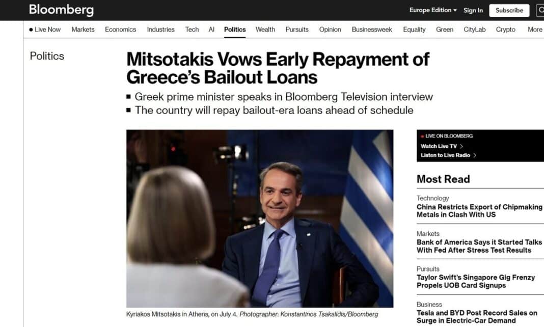 Το πρακτορείο αναφέρει πως ο Μητσοτάκης κέρδισε μια μεγάλη πλειοψηφία τον περασμένο μήνα για να παραμείνει άλλα τέσσερα χρόνια στην εξουσία, με τους πολίτες να δίνουν στη συντηρητική κυβέρνησή του εντολή να εφαρμόσει φιλικές προς τους επενδυτές πολιτικές τις οποίες είχε διαφημίσει κατά τη διάρκεια της εκστρατείας του. Αυτό θα σημάνει την κατάργηση του χρέους της Ελλάδας των 356 δισεκατομμυρίων ευρώ (388 δισεκατομμυρίων δολαρίων), το υψηλότερο σε σχέση με την παραγωγή στη ζώνη του ευρώ.