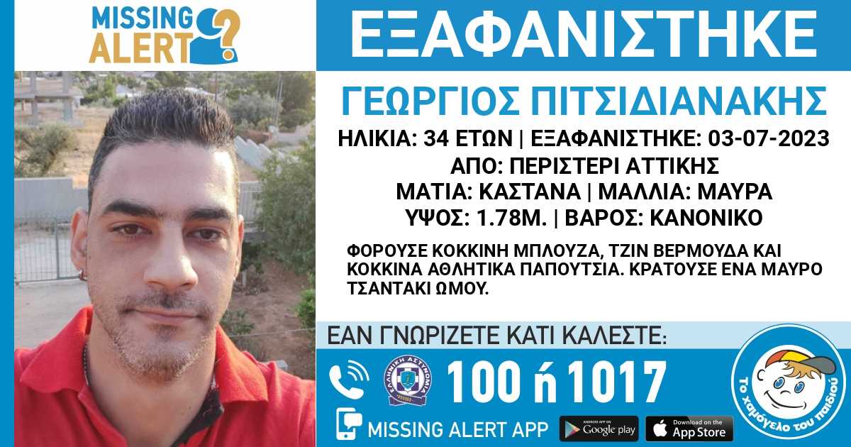 Στις 3 Ιουλίου 2023, ξημερώματα, εξαφανίστηκε από την περιοχή του Περιστερίου Αττικής ο Πιτσιδιανάκης Γεώργιος, 34 ετών. Το «Χαμόγελο του Παιδιού» ενημερώθηκε σήμερα, 04/07/2023, για την εξαφάνιση του Πιτσιδιανάκη Γεώργιου, και προχώρησε στη δημοσιοποίηση των στοιχείων του ενήλικα κατόπιν αιτήματος της οικογένειάς του, καθώς ενδέχεται να συντρέχουν λόγοι οι οποίοι θέτουν τη ζωή του σε κίνδυνο.