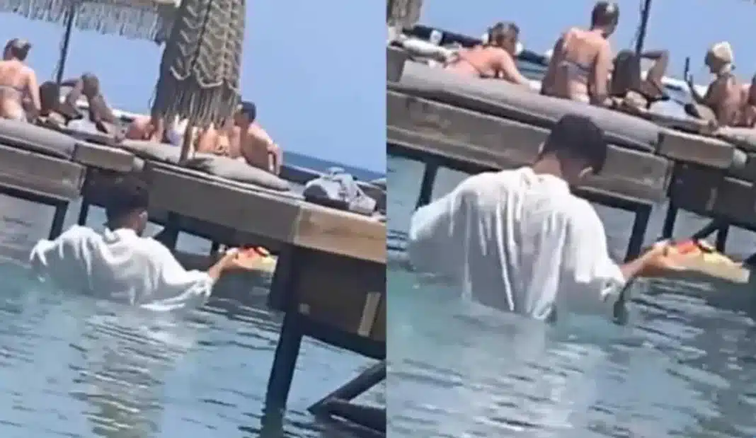 Οι πλωτές ξαπλώστρες παραμένουν στη θέση τους όπως και οι κατασκευές στην παραλία. Σερβιτόροι κολυμβητές, δίσκοι γεμάτοι φαγητά και ποτά για τους «εκλεκτούς πελάτες» και οι τιμές για γερά πορτοφόλια. Η παράνομη πλωτή ξαπλώστρα χρεώνεται 150 ευρώ.