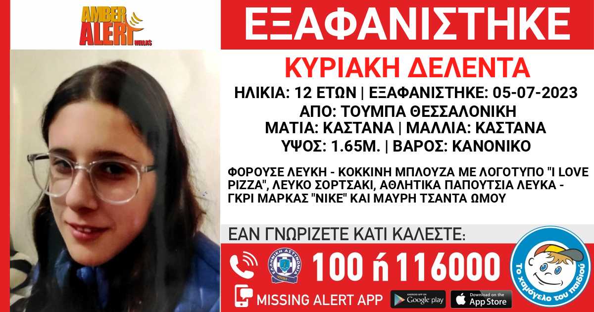 Στις 05/07/2023 μεσημβρινές ώρες, εξαφανίστηκε από την Τούμπα Θεσσαλονίκης, η Κυριακή Δελέντα, 12 ετών.