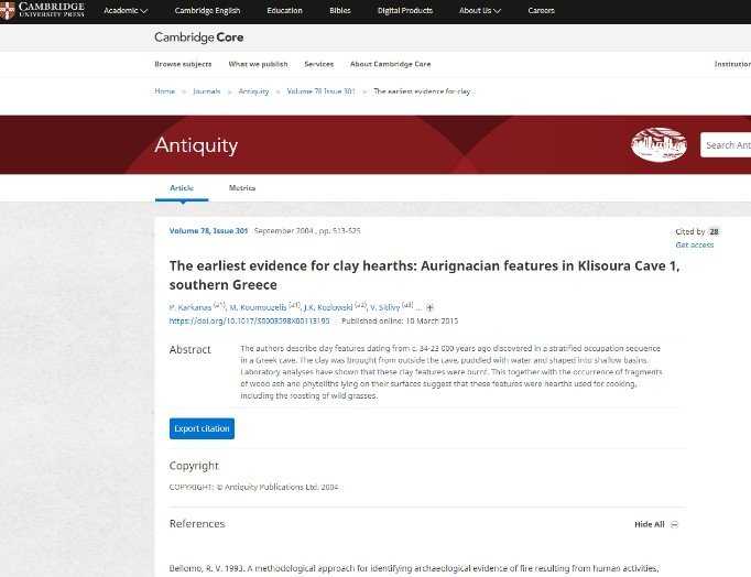 Βλ.: P. Karkanas, M. Koumouzelis, J. K. Kozlowski, V. Sitlivy «The earliest evidence for clay hearths: Aurignacian features in Klisoura Cave 1, southern Greece», Volume 78, Issue 301, Σεπτ. 2004 , σελ. 513-525.