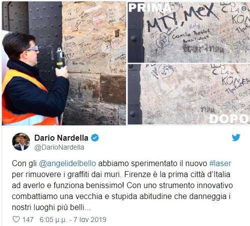 Μάλιστα, ο δήμαρχος της Φλωρεντίας Ντάριο Ναρντέλα χρησιμοποίησε ο ίδιος τη συσκευή, ισχύος 50W, για να καθαρίσει γκράφιτι (ίσως και αυτό της Ελληνίδας…) στην Ponte Vecchio. «Θέλουμε να χρησιμοποιήσουμε αυτή την τεχνολογία και σε άλλα μνημεία της πόλης μας» διευκρίνισε.