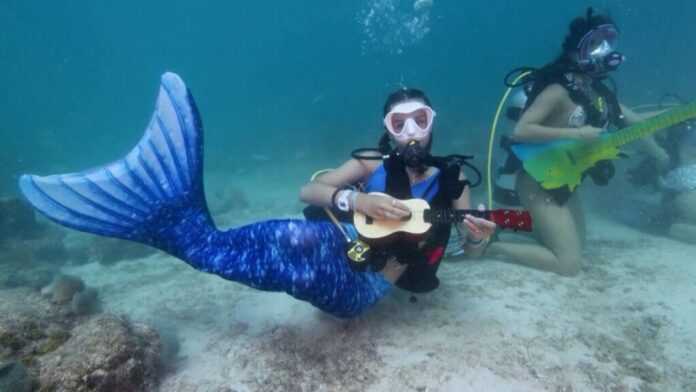 Οι δύτες – μερικοί ντυμένοι γοργόνες – μιμήθηκαν το παίξιμο μουσικών οργάνων για να προωθήσουν την περιβαλλοντικά υπεύθυνη κατάδυση και τη διαφύλαξη του πολύτιμου κοραλλιογενή υφάλου της περιοχής.