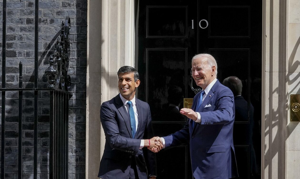 Χαμογελαστός, ο πρόεδρος των ΗΠΑ έσφιξε το χέρι του Βρετανού πρωθυπουργού, ποζάροντας για σύντομο διάστημα στις κάμερες στην είσοδο της Ντάουνινγκ Στριτ. Ο Αμερικανός πρόεδρος πραγματοποιεί σήμερα σύντομη επίσκεψη στη Βρετανία, την πιο στενή σύμμαχο των ΗΠΑ, κατά την οποία θα συναντηθεί επίσης με τον βασιλιά Κάρολο, πριν από την σύνοδο κορυφής του NATO στη Λιθουανία.