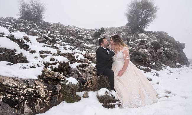 Και όμως το τόλμησαν… και το νιόπαντρο ζευγάρι βγήκε στα χιόνια για τις καθιερωμένες φωτογραφίες του γάμου.