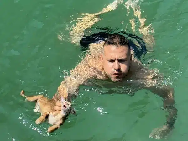 Συγκεκριμένα, οι δύο άνδρες άκουσαν ξαφνικά κλάματα. Τότε εντόπισαν ένα μικρό γατάκι στη θάλασσα να παλεύει να μην πνιγεί. Ο ένας εκ των δύο, χωρίς να διστάσει, βούτηξε στο νερό και άρχισε να κολυμπάει μέχρι το σημείο που ήταν το μικρό ζωάκι.