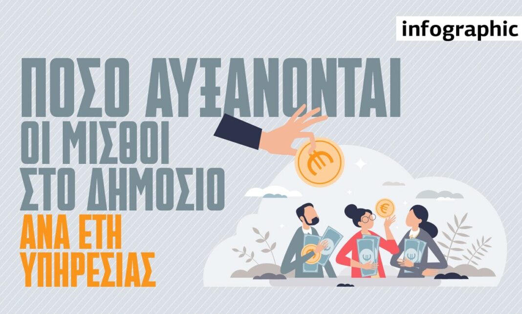 Με τις αυξήσεις που θα εφαρμοστούν από 1/1/2024 προκύπτει μεσοσταθμική αύξηση 6,5% στα μισθολόγια των δημοσίων υπαλλήλων και περίπου 10,5% αύξηση στις απολαβές τους από το σύνολο των παρεμβάσεων που υλοποιούνται την περίοδο 1/1/2023 έως 1/1/2024.