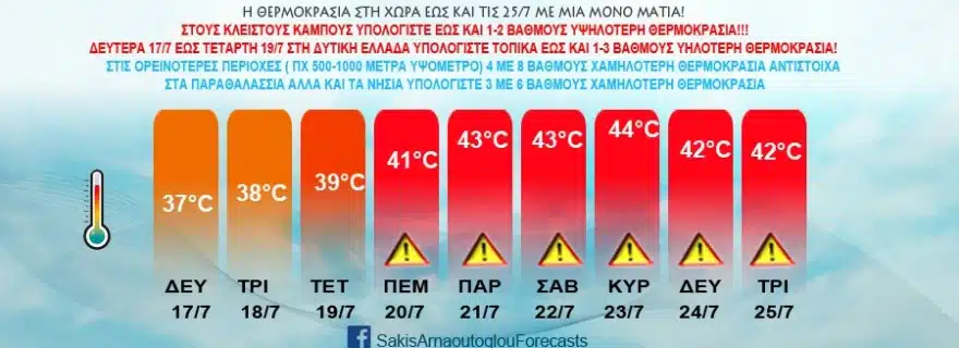 Στο μετεώγραμμα που ανήρτησε την Κυριακή το μεσημέρι ο προγνώστης της ΕΡΤ, Σάκης Αρναούτογλου, η «ανηφόρα» για τις θερμοκρασίες ξεκινά την Τετάρτη με 39 βαθμούς Κελσίου κατά μέσο όρο και το «γκάζι» σε θερμοκρασίες πάνω από 41 βαθμούς Κελσίου μένει «πατημένο» για τουλάχιστον έξι ημέρες.