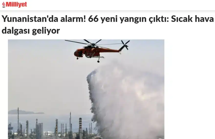 «Συναγερμός στην Ελλάδα! 66 νέες πυρκαγιές: Έρχεται κύμα καύσωνα» είναι ο τίτλος δημοσιεύματος της εφημερίδας Milliyet. «Οι περισσότερες από αυτές κατασβέστηκαν ως αποτέλεσμα της ταχείας αντίδρασης των ομάδων πυρόσβεσης. Συνεχίζονται οι φωτιές γύρω από την πρωτεύουσα Αθήνα και τη Ρόδο» σημειώνει το δημοσίευμα.