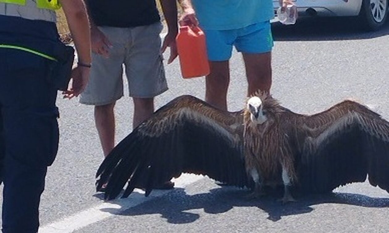 Τον άτυχο γυπαετό βρήκαν στη μέση του ΒΟΑΚ οδηγοί οι οποίοι είχαν την ευαισθησία να σταματήσουν και να του δώσουν λίγο νεράκι.
