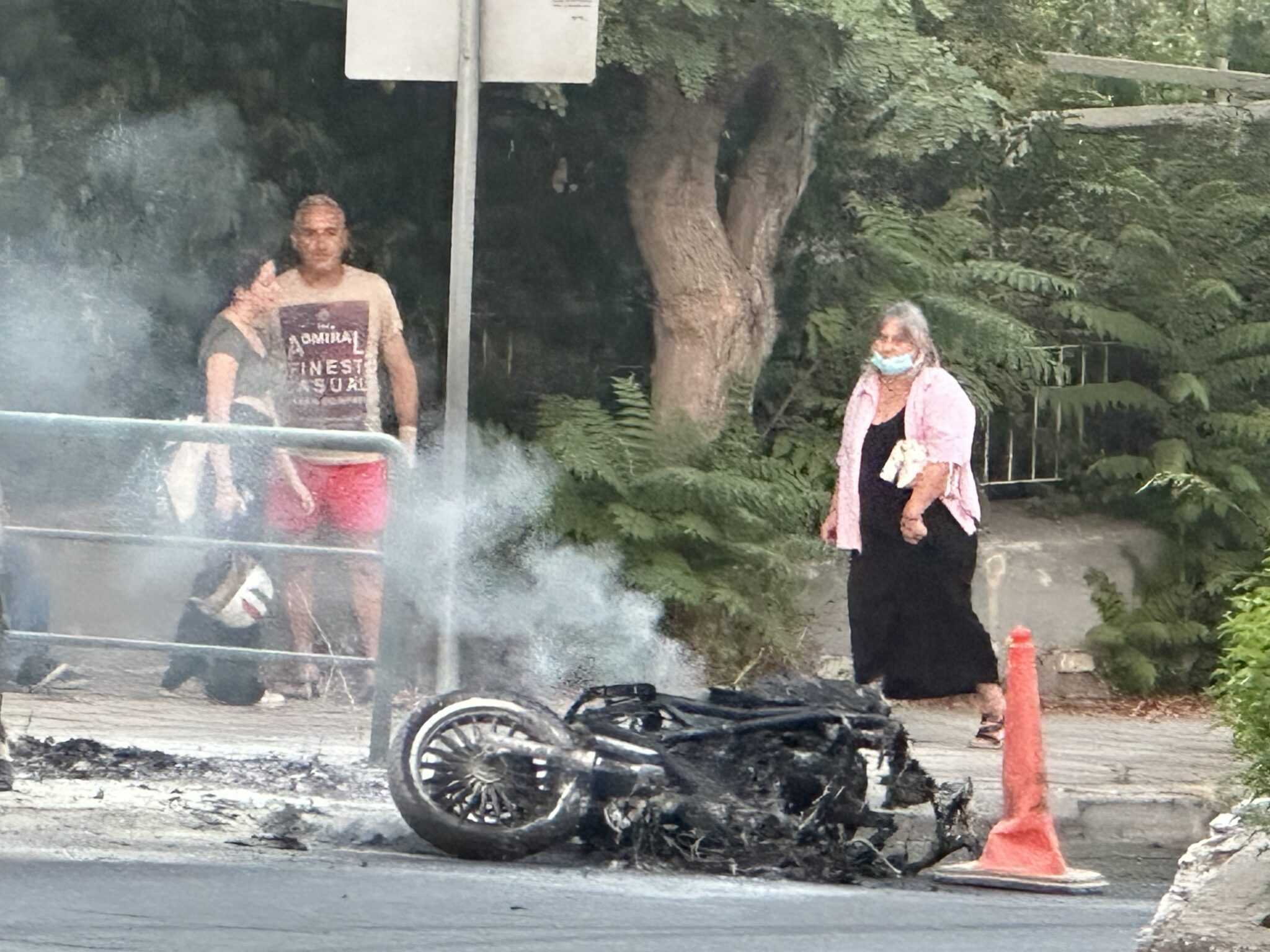 Στο σημείο έσπευσε άμεσα όχημα της Πυροσβεστικής για να σβήσει την φλεγόμενη μοτοσυκλέτα.
