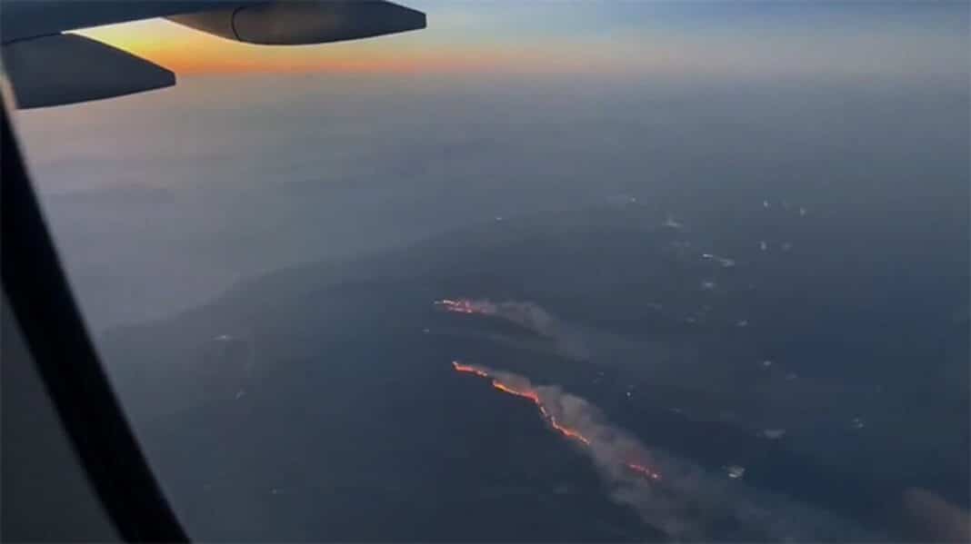 Βίντεο που αναρτήθηκε από χρήστη του Twitter μέσα από αεροπλάνο δείχνει το μέγεθος του μετώπου της φωτιάς στη Ρόδο που εκτείνεται σε μήκος πολλών χιλιομέτρων.