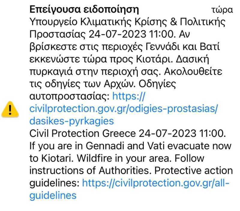Ρόδος: Μήνυμα στις περιοχές Γεννάδι και Βατί για εκκένωση προς Κιοτάρι