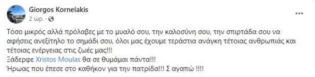 Σπαρακτικό είναι και το μήνυμα του ξαδέρφου του, Γιώργου Κορνελάκη, στο Facebook: “Τόσο μικρός αλλά πρόλαβες με το μυαλό σου, την καλοσύνη σου, την σπιρτάδα σου να αφήσεις ανεξίτηλο το σημάδι σου, όλοι μας έχουμε τεράστια ανάγκη τέτοιας ανθρωπιάς και τέτοιας ενέργειας στις ζωές μας!!! Ξάδερφε Xristos Moulas θα σε θυμάμαι πάντα!!! Ήρωας που έπεσε στο καθήκον για την πατρίδα!!! Σ αγαπώ !!!!”.