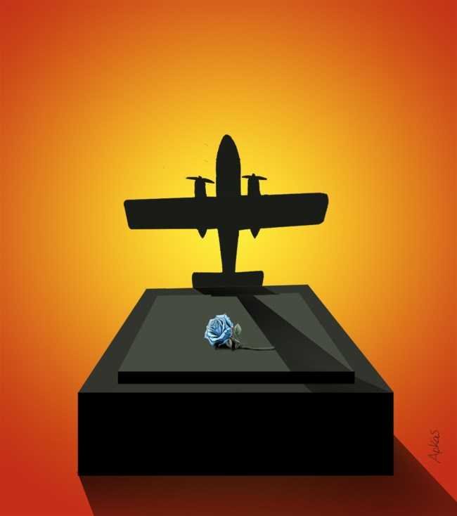 Στο ανατριχιαστικό σκίτσο του Αρκά, με κόκκινο-πορτοκαλί φόντο λόγω των πυρκαγιών, ένας τάφος με ένα μπλε τριαντάφυλλο πάνω, ενώ ο σταυρός σχηματίζεται από ένα αεροπλάνο.