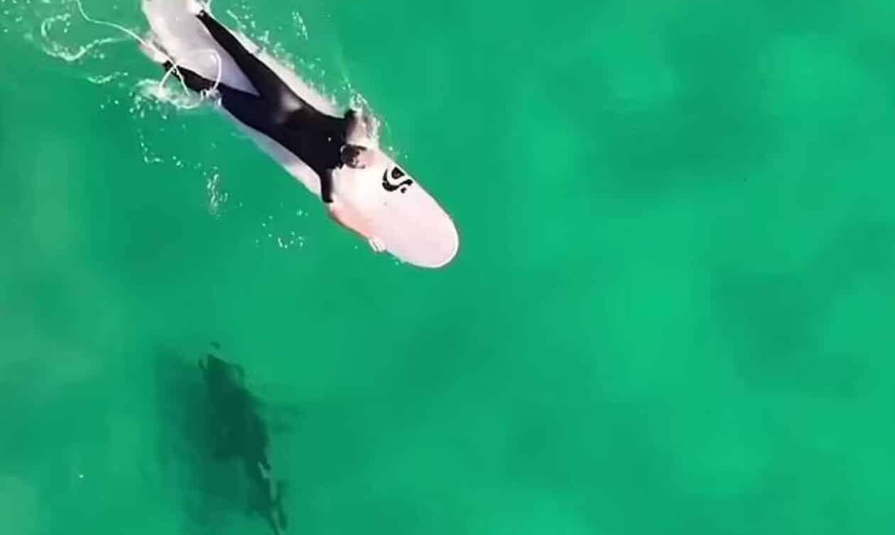 Drone κατέγραψε την εκπληκτική στιγμή που ένας καρχαρίας κολυμπά ανάμεσα σε πλήθος ανυποψίαστων ανθρώπων που κάνουν surfing αλλά και μίας μάζας από ψάρια.
