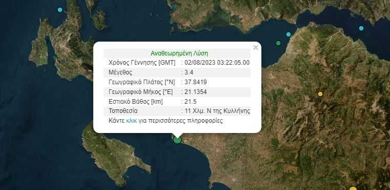 Στο ρυθμό των 3,4 Ρίχτερ «χόρεψε» το πρωί της Τετάρτης η Κυλλήνη. Σύμφωνα με το Γεωδυναμικό Ινστιτούτο το επίκεντρο της δόνησης εντοπίζεται στα 11 χλμ. νότια της Κυλλήνης.