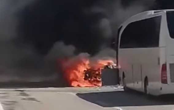 Το αυτοκίνητο της 66χρονης συγκρούστηκε με λεωφορείο που μετέφερε Κινέζους τουρίστες, και λίγα δευτερόλεπτα μετά τυλίχθηκε στις φλόγες.
