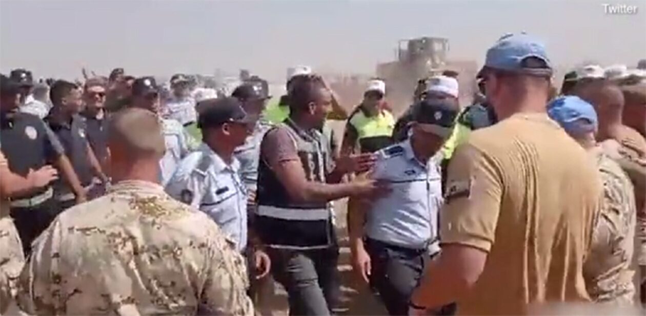 Αυτά καθώς τα μέλη της ειρηνευτικές αποστολής κινούνται προς τα πίσω με τα χέρια υψωμένα προσπαθώντας να προστατευτούν.