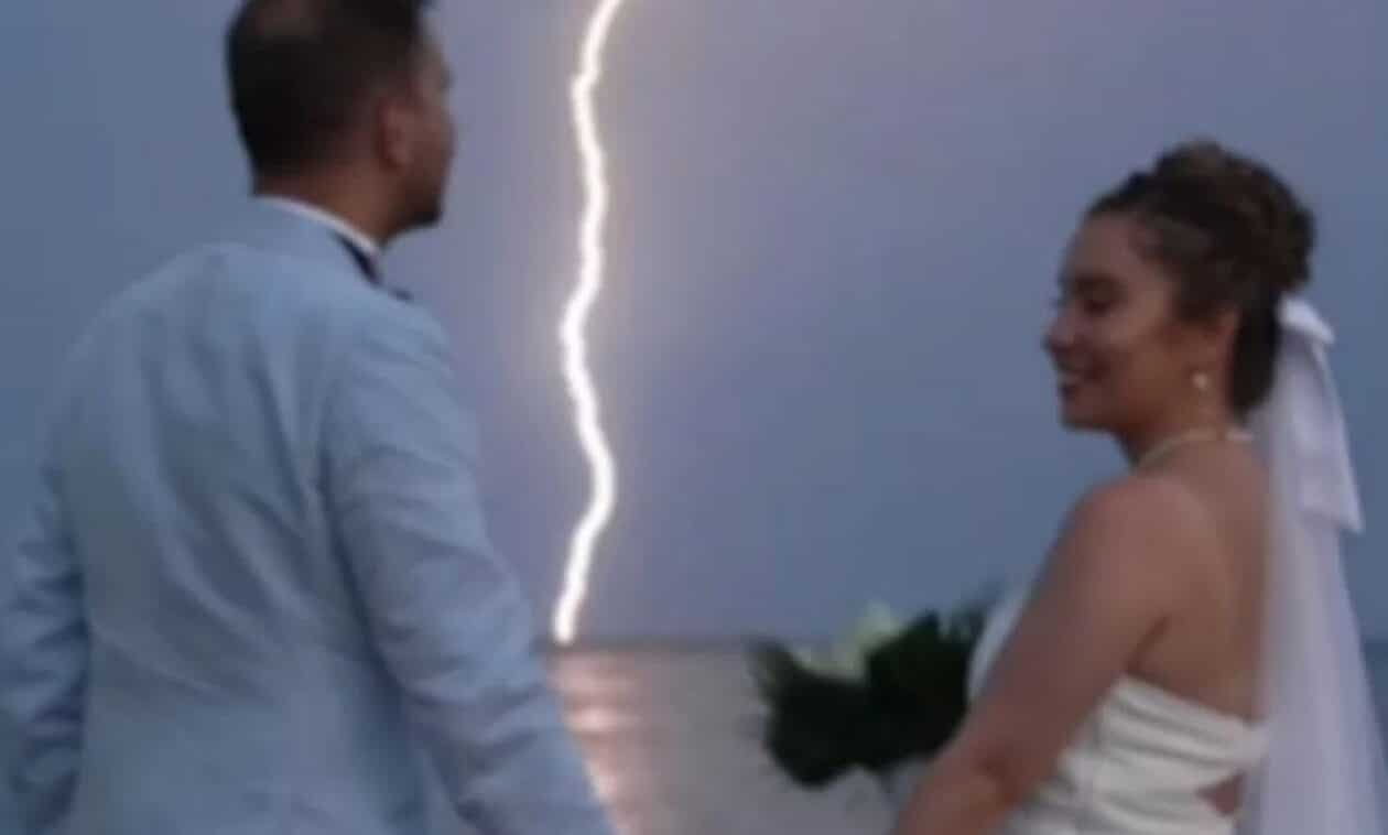 Το νεόνυμφο ζευγάρι με φόντο τη θάλασσα έδωσε ένα φιλί όταν ο ουρανός χωρίστηκε στα δύο από κεραυνό, μιας και μία καταιγίδα βρισκόταν σε εξέλιξη στα ανοιχτά του νησιού.