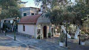 Μέσα σε ένα καταπράσινο τοπίο με παγκάκια, με τα δέντρα να ρίχνουν τη δροσερή σκιά τους, προβάλλει το μικρό ξωκκλήσι.