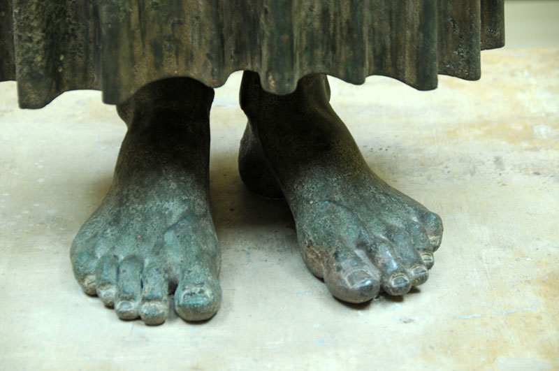 Το ίδιο εκπληκτική είναι και η απόδοση των ποδιών του Ηνίοχου, που πατούν στέρεα στο βάθρο, με τις φλέβες τους να δίνουν την εντύπωση ότι σφύζει μέσα τους το αίμα.