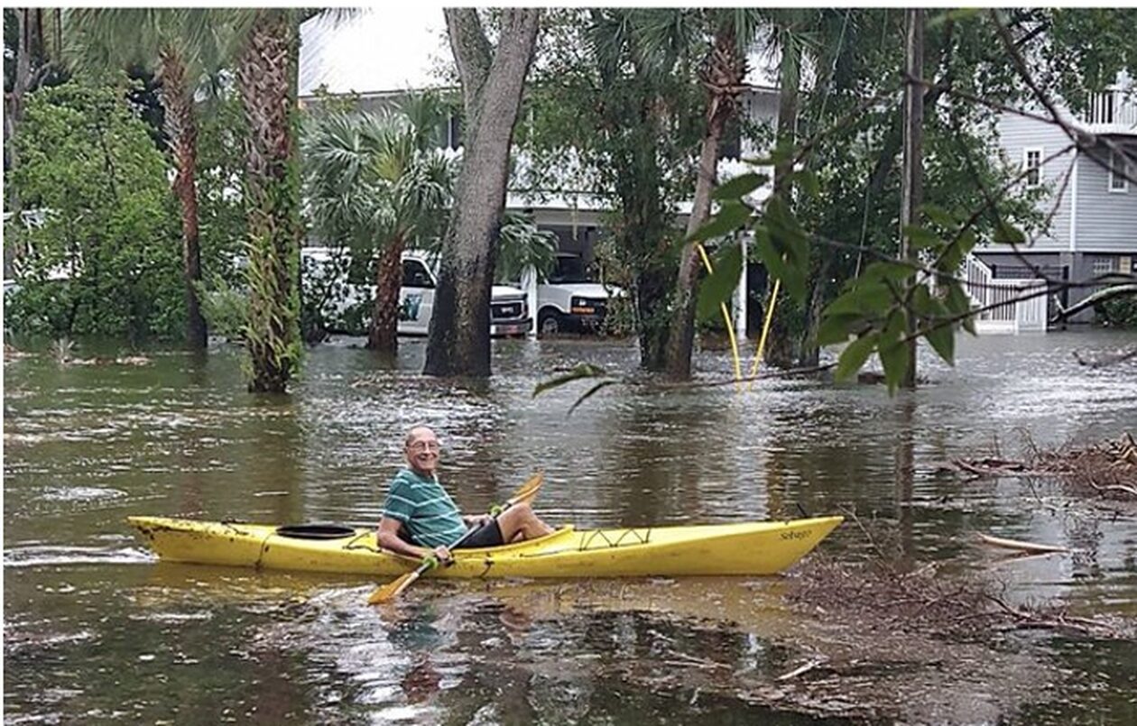 Κανό και φουσκωτά κυκλοφορούν στους πλημμυρισμένους δρόμους του Τάρπον Σπρινγκς, στη Φλόριντα, μίας πόλης που έχει τον μεγαλύτερο ελληνικής καταγωγής πληθυσμό στις ΗΠΑ.