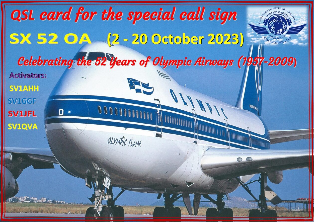 Το ελληνικό τμήμα του διεθνούς συλλόγου ραδιοερασιτεχνών 5ος Ωκεανός (5th Ocean Club) για να τιμήσει τα 52 χρόνια λειτουργίας της “Ολυμπιακής” διοργανώνει και ενεργοποιεί Διεθνή Ραδιοερασιτεχνικό Διαγωνισμό στις ραδιοερασιτεχνικές μπάντες με το Ειδικό Διακριτικό Κλήσης SX52ΟΑ. Η έγκριση του οποίου έχει γίνει από το Υπουργείο Ψηφιακής Διακυβέρνησης.
