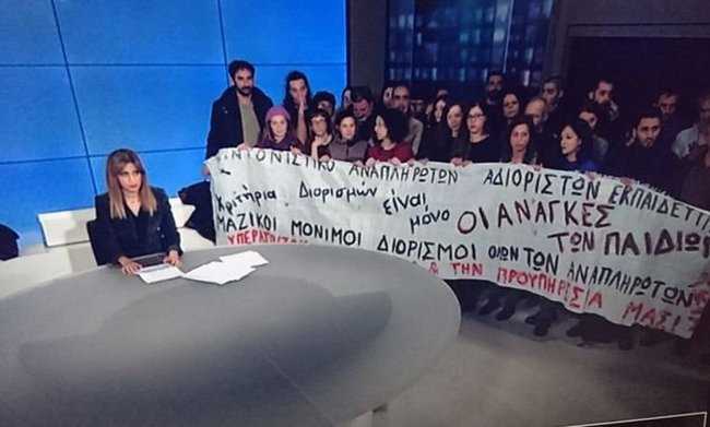 Χθες, κατά τη διάρκεια της προβολής του κεντρικού δελτίου ειδήσεων στην ΕΡΤ εισέβαλαν στο πλατό εκπαιδευτικοί με πανό, αποφασισμένοι να κάνουν γνωστά τα αιτήματά τους. Κεντρική παρουσιάστρια ήταν η Αντριάνα Παρασκευοπούλου η οποία και διέκοψε αμέσως για να πάει σε διαφημίσεις.